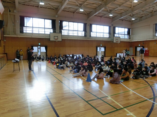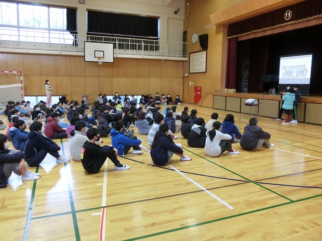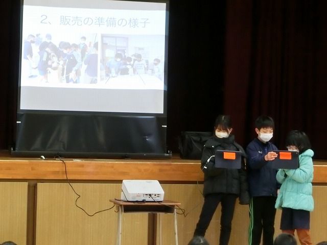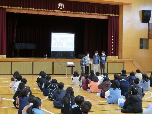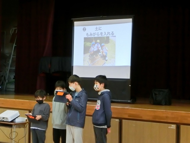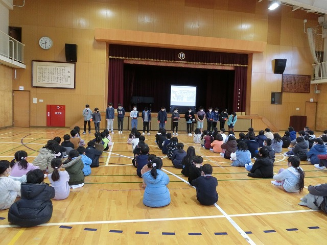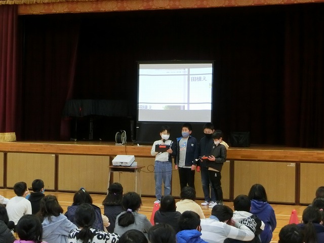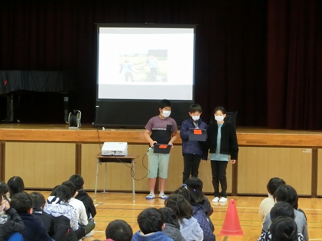2月15日(水)朝学習の時間に児童朝礼を行いました。今回は5年生が今年度「田んぼの学校」で取り組んできた米作りについて発表しました。6月の苗づくりから始まり、稲刈りや脱穀、普賢寺ふれあいの駅での販売まで、それぞれのグループで分担し作成したスライドに大きく映しながら説明しました。それぞれの過程で感じたことも多かったようで、感想も交えながら全校児童に上手に伝えてくれました。