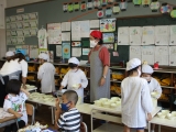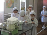 1年生にとっては初めての給食当番です。こぼさないようにワゴンを運んだり、一人分の量が多かったり少なかったりしないように気を付けたり、いろいろと気を配りながらしっかりと配膳ができました。