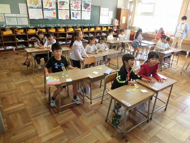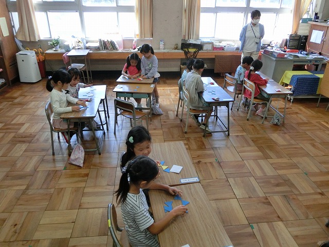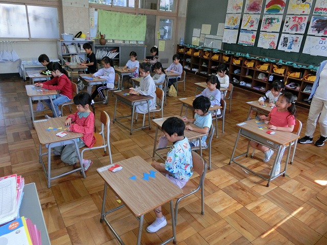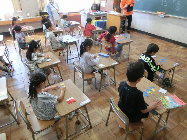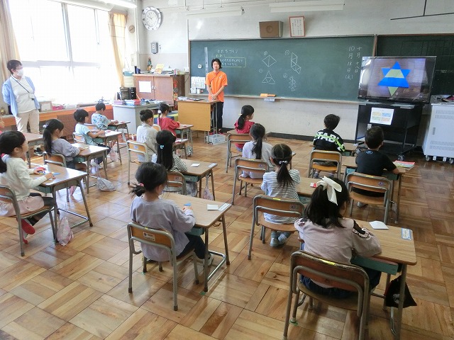 10月18日(水)1年生は、算数の時間に「ならべかたをかんがえてかたちをつくろう」をめあてに形作りに取り組みました。二等辺三角形の板を組み合わせ、亀井先生が出題する様々な形作りに挑戦しました。