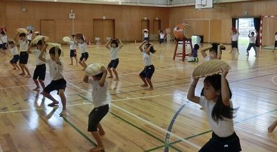 9月11日(木)、体育館で表現の練習をする低学年です。この日は和太鼓が登場し、「まつり はながさ」の雰囲気が一気に出てきました。