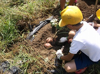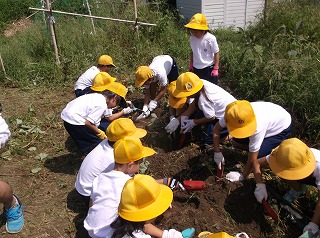 9月13日(水)1、2年生がいもほりをしました。春にさつまいもの苗を植え付けて、その後順調に育っていましたが、夏季休業中に半分以上が小動物に食べられていました。この日は残っていた部分を掘り起こしました。結果、何個か大きい芋が育っていて無事収穫することができました。収穫した量は少なかったですが、来年こそ豊作を目指したいと考えます。