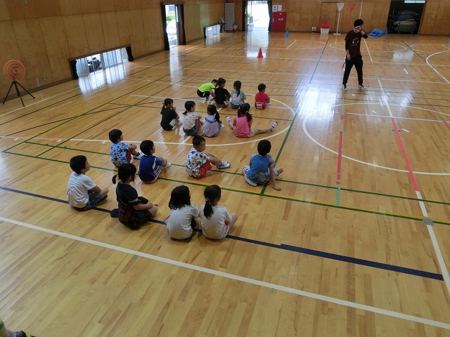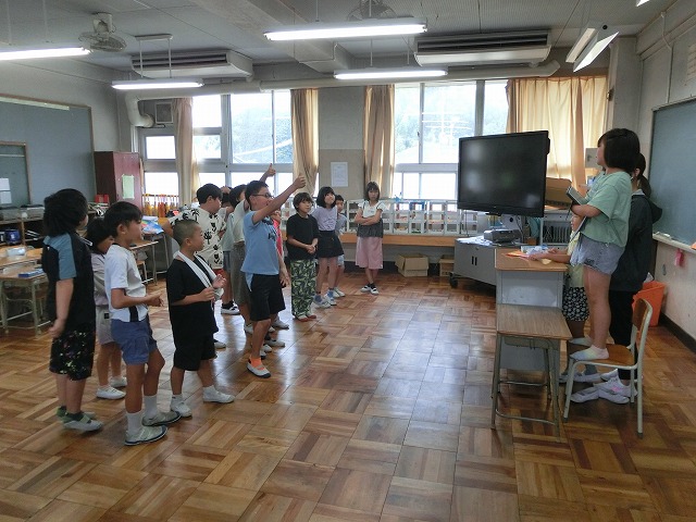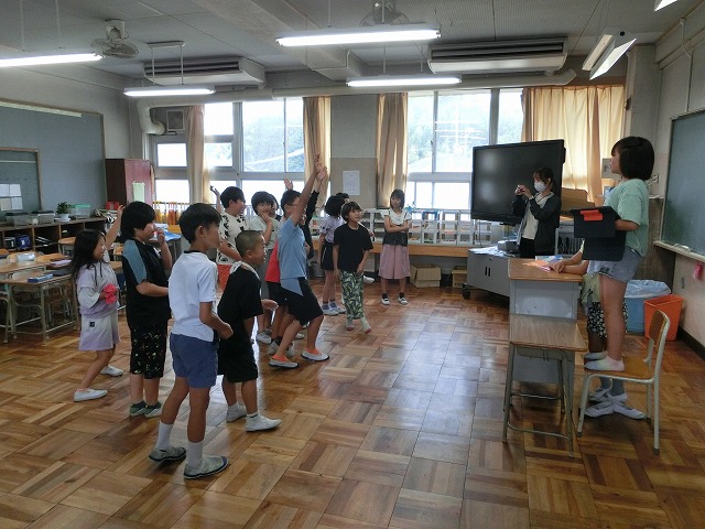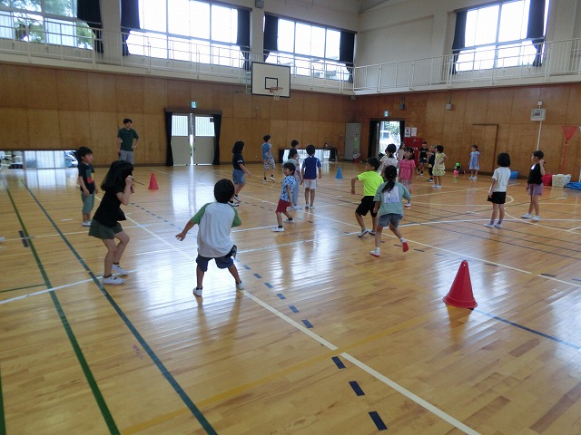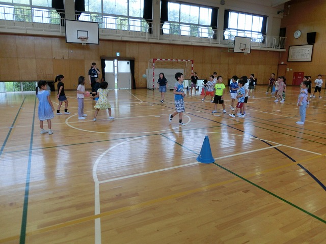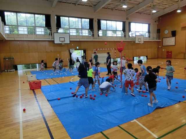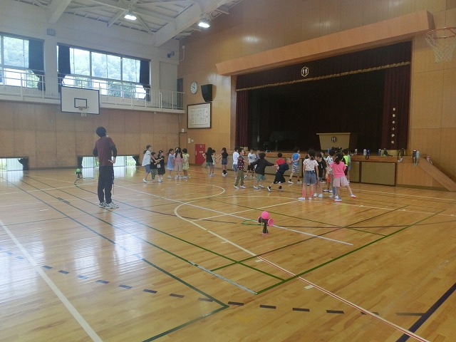 7月13日(木)今日は雨のため、1・2年生がそれぞれ予定していた校区探検に行けませんでした。そのストレスを発散するため体育館で、様々なレクリエーションで盛り上がりました。