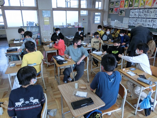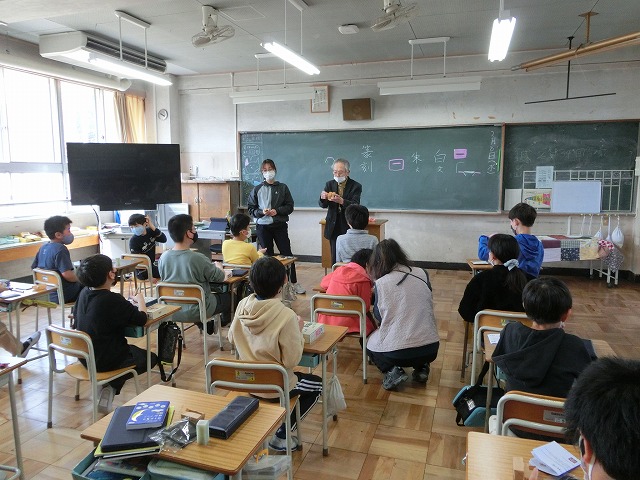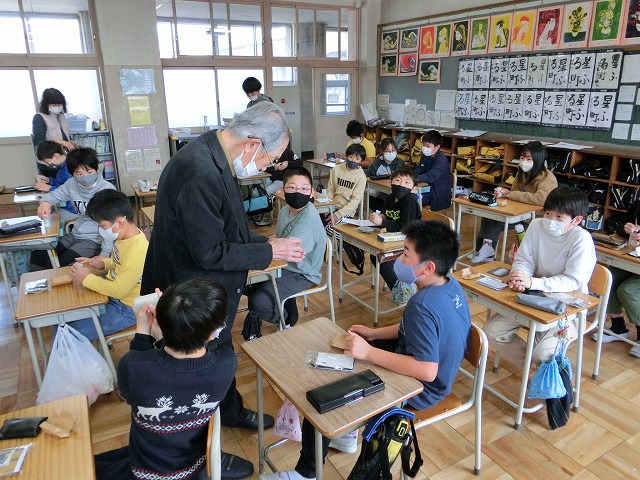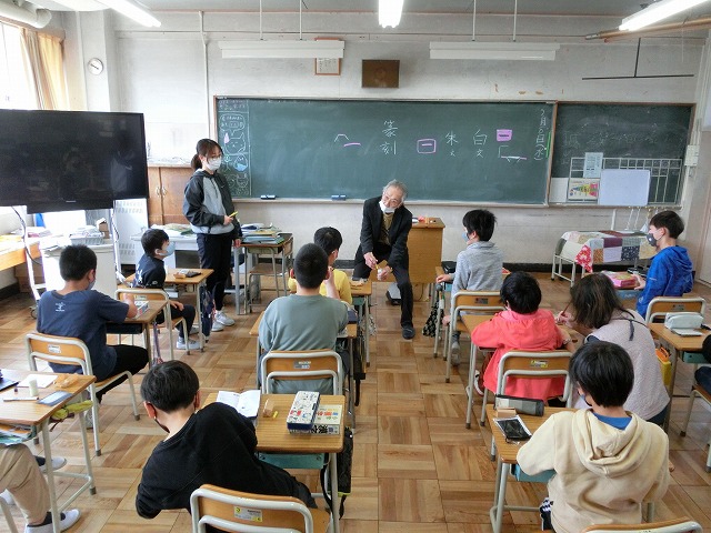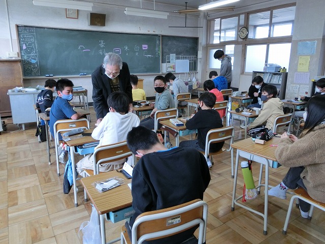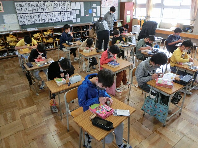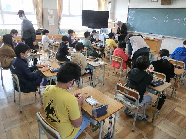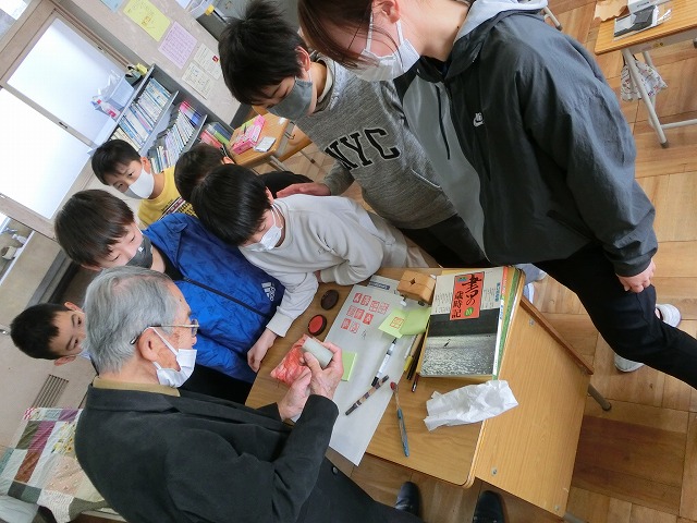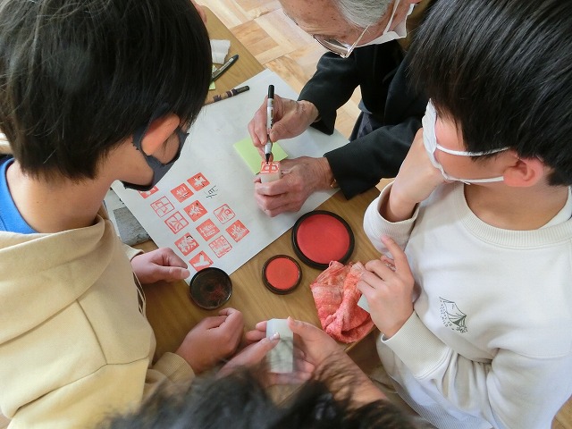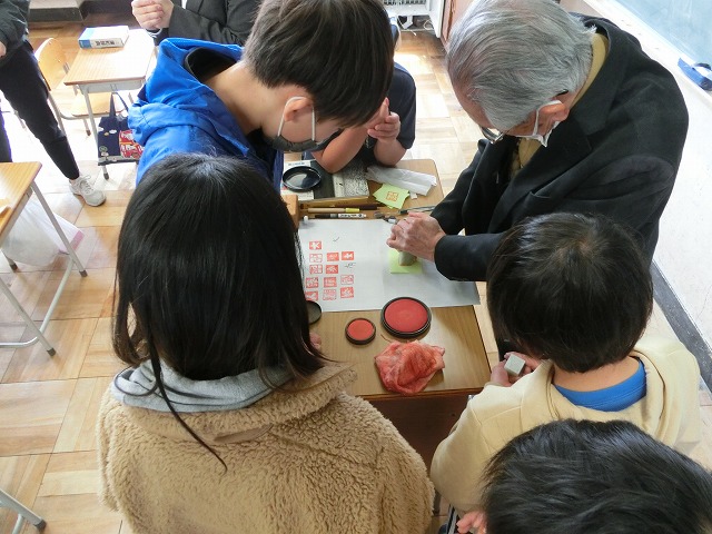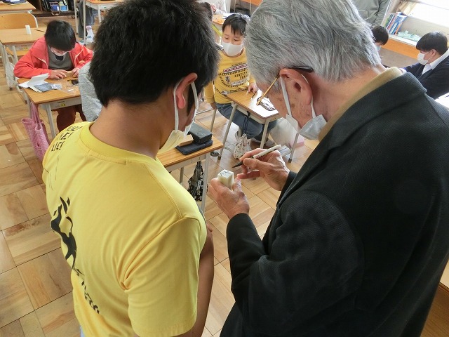 3月8日(水)今日の3・4時間目に5年生が地元の書道家:辻尾仁郎先生に来校いただき、てん刻作りの授業を受けました。下書きとしてハンコに書いた字を辻尾先生に確認してもらい、それぞれ彫り進めていきました。途中、辻尾先生の『試し押し』で彫残しを確認してもらい、粘り強く仕上げていきました。
