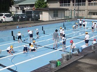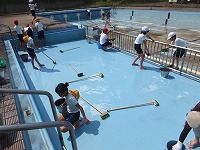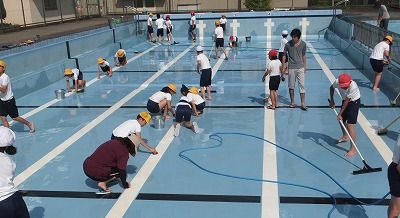 初めて参加した5年生も、先生の指示にしたがって一生懸命がんばりました。みんなのがんばりで、プールの底の青があざやかに見えてきました。しばらく天日干しにした後、6月の中頃から泳ぎ始めます。今年も安全に気をつけて、しっかりとした泳力を付けましょう。