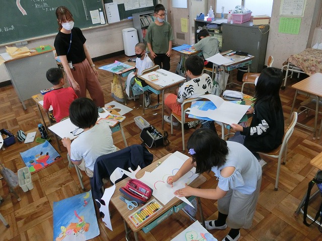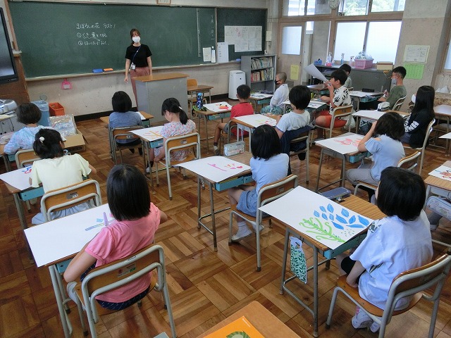 7月11日(火)4年生は図工の時間に「まぼろしの花ラスト!」ということで、今まで描いてきた2つの絵(背景&葉茎)を合体させて、一番目立つ「花」を描きました。自分たちの想像を膨らませて素敵な作品たちが仕上がっていました。