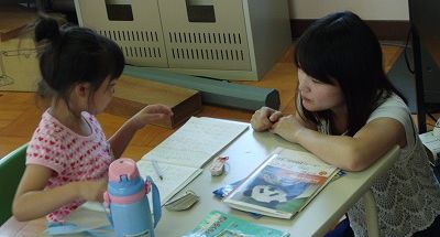(写真↑は7月25日の朝の学習会の様子です:学生ボランティア:同志社女子大)