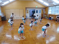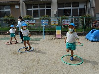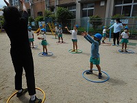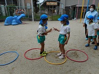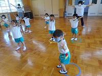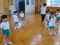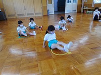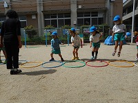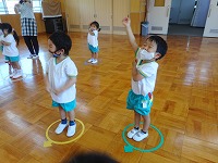 フープを並べて両足ジャンプをしたり、ドンじゃんけんをしたり…自然と笑顔になり楽しみました。