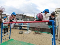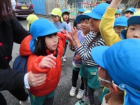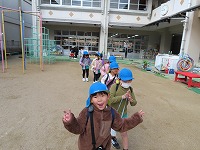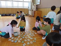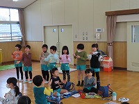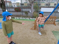 5歳児が、三山木幼稚園にバスで行きました。前回11月は、普賢寺幼稚園にきてくれたので楽しみしていた子ども達です。三山木幼稚園に着くときりん組のお友達が園庭で出迎えてくれていました。早速、園庭で好きな遊具で遊んだり、ドッジボールを一緒にしたりして楽しく過ごしました。お弁当は、「一緒に食べよう」と誘ってもらいホールで食べました。食後は、一緒におやつを食べたり、こまやけん玉、あやとりやカルタなどをしたりして遊びました。こまは、三山木幼稚園のお友達が得意技をみせてくれて刺激になったすみれ組のこども達です。