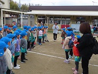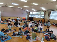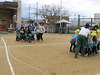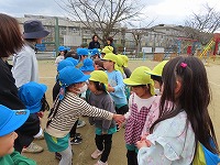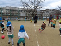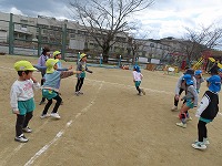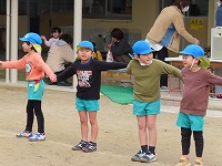 お弁当後は、園庭では、ドッジボール大会をしました。たくさんのお友達に囲まれてボールが飛び交い元気いっぱい遊ぶことができました。最後は、フォークダンスでふれあいを楽しむことができました。「小学校で会えるね」「中学生になったら、みんな同じ中学校かもね」「楽しかったこと覚えていようね」と、近くの幼稚園のお友達とふれあいの時間を楽しむことができました。