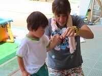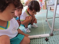 カブトムシになりました 昨年の冬に地域の方から、たくさんカブトムシの幼虫をいただきました。土の中で眠っていたカブトムシを「まだかな、まだかな」と成虫になって出てくることを楽しみに待っていた子ども達…暑くなり、ガサゴソガサゴソ土の中から出てきました!「カブトムシになった!」「嬉しい!」「カブトムシってかっこいいな」と大喜びでした。