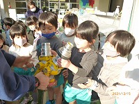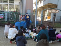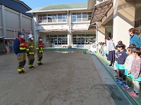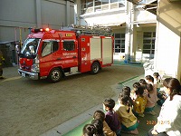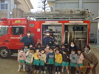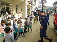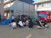 災の避難訓練をしました。今日は京田辺市消防本部から消防車と消防士さんが来てくださり、避難の様子を見ていただき指導してもらいました。静かに速く避難できたことをほめていただきました。「お・は・し」の約束「押さない」「走らない」「しゃべらない」に加えて「も」の「戻らない」を新しく教えてもらいました。