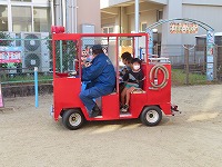 年長すみれ組はミニ消防車に乗せてもらいました。「楽しい」「○○くんヤッホー!」「おーい!」などなどとっても喜んでいました。消防車を見せてもらい、興味津々の子ども達でした。