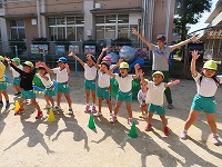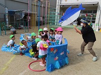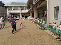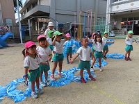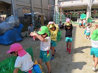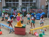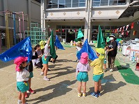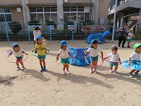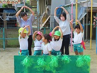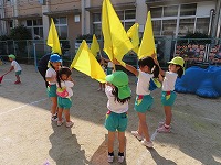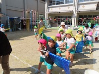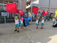 運動会を12日に無事に終えましたが、園庭では運動会ごっこを楽しんでいます。子ども達は「旗やってみたい」「ちびっこザウルスの踊りしたい」と他のクラスの表現遊びをしたり、自分の役を交代して遊び、5歳児のすみれ組は3、4歳児の友達にやさしく教えてあげる様子も見られました。運動会まで、他のクラスの演技をみたり応援したりしていたので、子ども達は自分なりに表現を楽しみ満足そうでした。これからも、異年齢のかかわりを大切にしながら遊んでいきたいと思います。