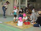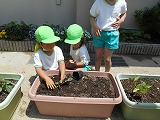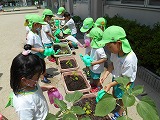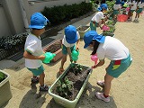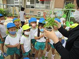 少しでも涼やかになりますように!大きく育ちますように!と願って、先生たちが緑のトンネルを作りました。早速、「あっ!トンネルできてる!」と気付いて、トンネルを通る姿が見られました。