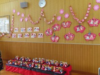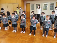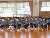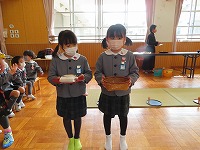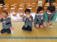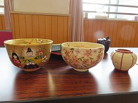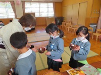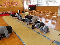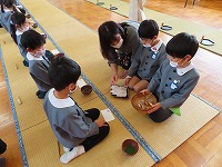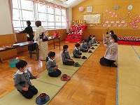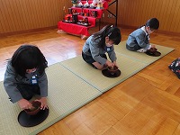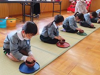 ひな祭りお茶会 今日は3月3日、桃の節句です。幼稚園ではひな祭りお茶会をしました。子ども達が作ったお雛様を見ながらひな祭りの由来を聞いたり、うれしいひなまつりの歌を歌ったりしました。 お茶の先生に、来ていただき季節のお茶碗などのお道具を見せてもらった子ども達は「きれいな」「お雛様のお茶碗かわいいな」と眺めていました。5歳児は、自分で作ったお茶碗で「ご自服」に挑戦しました。お茶の点て方やお辞儀も思い出して落ち着いてすることができました。3歳児は、「お菓子おいしいな」「抹茶も飲めたよ」と、初めてのお茶会を嬉しそうにしていました。 今年度も地域の茶道の先生にお世話になり、京都にゆかりの深い茶道の伝統文化を体験することができました。茶道を通して、相手への思いやりや心遣いを知る機会になればいいなと思います。