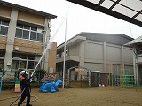 先生たちの消火訓練を見ました。消火器を見て「これ知ってる!」と答える子どももいました。みんな早く消えるように応援してくれました。