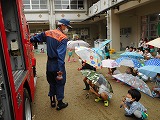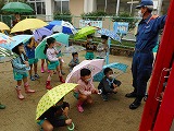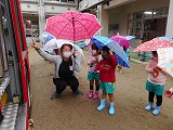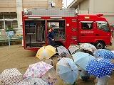 あいにくのお天気でしたが、幼稚園に消防士さんと消防車が来てくださいました。「消防車きた~」「大きい」と朝から目をキラキラさせていた子ども達です。先週、事前に防火のDVDを見て火の恐ろしさや約束を先生と確認しました。