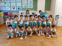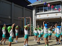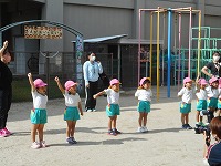 4歳児たんぽぽ組も元気いっぱい・笑顔いっぱい手足を振って入場しました。大好きな体操「全力ビクトリー」で体を動かしました。