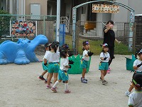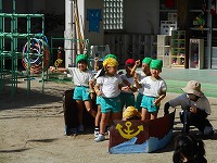 リズム表現「僕らは小さな海賊だ!」海賊やクラゲ、魚になって、宝島に宝探しに行きます。たんぽぽ組みんなで考えた動きで、いろんな役を交代して楽しんできました。宝物の手作りマラカスが太陽の光に照らされて、キラキラ素敵でした。