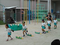大好きな絵本「ダンゴムシ忍者」のお話のリズム表現したもも組の子ども達。ダンゴムシが忍術を虫たちから教えてもらう修行に出掛けます。いろいろな虫になりきったり、ジャンプをしたり、リズムに合わせて踊ったりしました。