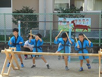 何度も何度も相談し、作り上げたリズム表現「ソイヤ」。春、地域の方から竹をいただき、1学期からいろいろな太鼓遊び、リズム遊びをしてきました。初めは音が揃わないことも多く、どうしたらみんなの心を一つに合わせられるか考えてきました。すみれ組みんなの思いの詰まった迫力のある演技を見せてくれました。