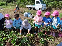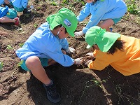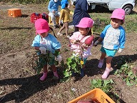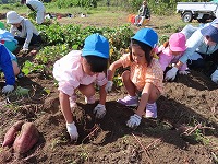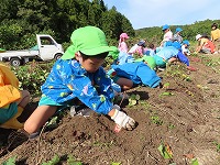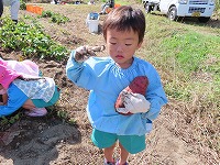 みんなが楽しみにしてきた芋掘りをしました。「お芋いっぱいなっているかな?」「大きいお芋かな?」と出発前から会話がはずんでいました。夏の間、水やりをがんばった子ども達…自分たちで植えて、世話をしてきたので、収穫の喜びもひとしおです。