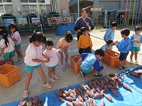今年も豊作でした。大きなお芋、小さなお芋、長いお芋…様々な形の芋が掘れました。早速、幼稚園に帰って大きさ比べをし、サイズに合わせてわけました。
