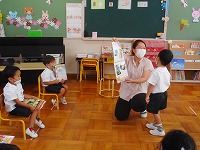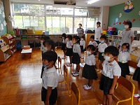 2学期始業式 長かった夏休みも終わり、今日から2学期のスタートです。 「先生!あのね…」と夏休みの出来事を話してくれたり、久しぶりに会う友達との再会を楽しんだりしていました。コロナ禍の夏休みでしたが、体調管理に配慮しながら、お家で工夫して過ごしてくださっていたことが、子ども達の話から伝わってきました。幼稚園でも引き続き、新型コロナウィルス感染症予防対策に留意して保育を行います。2学期もどうぞよろしくお願いします。   |