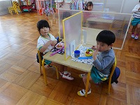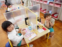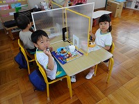 お弁当おいしかったよ  5月6日(木) 今日は、3歳児は幼稚園で初めてお弁当です。楽しみに登園してきたようで、「今日は、お弁当持ってきたよ」「おにぎりやねん」と、嬉しそうに話をしてくれました。お待ちかねのお弁当の時間は、みんなでお弁当の歌を歌い、準備も自分でしました。子ども達は、「みて、おにぎりお花やねん」「ウインナかわいいでしょ」など、お母さんの愛情いっぱいのお弁当の中身を教えてくれ、友達と一緒に楽しく食べていました。幼稚園に入園して、1か月がたち、幼稚園生活にも慣れてきた3歳児です。