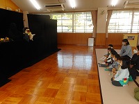 人形劇を見たよ 地域で活躍されている人形劇団ポラリスの皆さんが来てくださり、人形劇を鑑賞をしました。いつものホールに舞台が出来ていて、入った瞬間「うわぁ~」と声をもらす子ども達でした。始まるとすぐにお話の世界に入り込んでいきました。