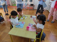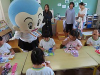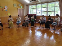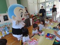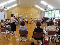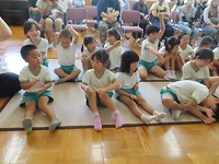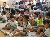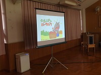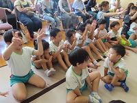 食育教室 京田辺市輝くこども未来室 管理栄養士、健康推進課の方々をお迎えし、親子食育教室を行いました。スライドを見て、バランスよく食べる大切さを教えてもらい、野菜クイズでは野菜の成り方や花を知りました。そしてスペシャルゲストに一休さんが来てくれ、大喜びでした。  保護者の方々は、ホールで懇談会を行いました。食に対する質問であったり、悩み事をみんなで共有したりしました。