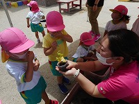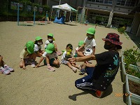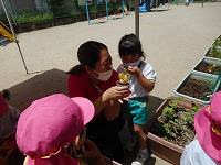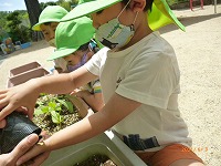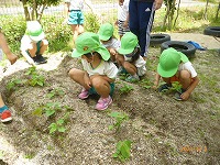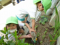 いつもすみれ組さんがしてくれているウサギのさくらちゃんのお世話をしたり、花の水やりをしたりしてがんばりました。ゴーヤとツルムラサキの苗を京田辺市からいただいたので、年中たんぽぽ組と年少もも組で植えました。「これ何の苗か知ってるかな?」「何かお野菜のにおいがする」など先生や友達とやりとりを楽しみながら植えました。