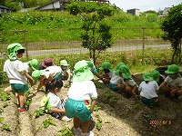 「大きくなぁれ!大きくなぁれ!」と踊りだして応援しているお友達もいましたよ。今年も緑のトンネルになりますように!夏野菜の生長を楽しみに過ごしたいと思っています。 幼稚園の裏庭に作ったサツマイモ畑に草がたくさん生えてきたので、草抜きもしました。春にはツクシだったのに、大きくなってスギナになっていて、新たな発見もありました。