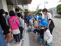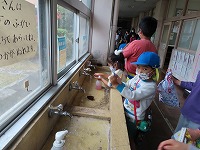 手を洗うことから一緒にしました。もみまき、田植え、稲刈り…とペアとなって一緒に活動してきたので、5年生のお兄さん・お姉さんにも、すっかり慣れている子ども達です。
