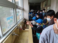 小学校の玄関で5年生が出迎えてくれました。