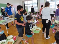 年長すみれ組は隣の普賢寺小学校に給食体験に行きました。毎日、園庭で遊んでいると、給食室からいいにおいがして「お腹すいたなぁ」「おいしそう」と話しています。憧れの給食を食べに行く日を楽しみにしていました。