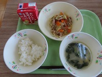 今日のメニューはご飯・豚肉の生姜焼き・小松菜の味噌汁・牛乳でした。「おいしい!」「おかわりしたい」「苦手だけど頑張って食べる!」「全部食べられたよ」等など子ども達の自信につながりました。