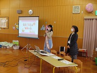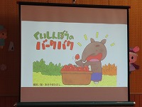 食育教室 京田辺市役所健康推進課が来園し、食育教室がありました。毎月19日は食育の日であることを知り、スライドを見て好きなものばかりでなく、バランス良く食べることや朝ごはんの大切さについて教えてもらいました。