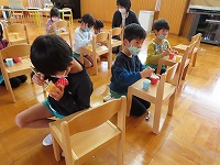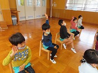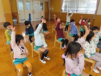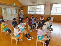 先週に給食体験があった5歳児は、食に興味をもって参加することができました。「食べたもので体はできている」ということを教えてもらい、「バランス満点ごはん」を目指して食べよう!と話してもらいました。これからも、好き嫌いをせず何でも食べて健やかに成長してほしいと願っています。 |