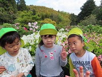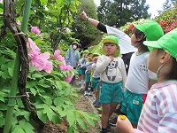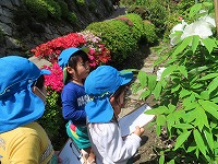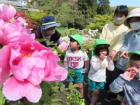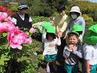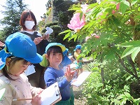 無二荘牡丹園見学 4,5歳児が地域のボタン園見学に行きました。途中までバスに乗り、春の自然を見ながら歩きました。ボタン園の庭は、小高い山全体がボタンの花でいっぱいで、その他、八重桜、ツツジなど色とりどりの花が子ども達を出迎えてくれました。ボタンを育てていらっしゃる辻尾先生に「昔のここのお家の人が、お米1俵とボタンの苗を交換したのが、今ではこれだけたくさんのボタンの花になったのだよ」とお話していただきました。子ども達が「いろんな色があるね」「どの色のお花が好き?」と話しながら庭を散策させていただきました。5歳児は、ボタンの花をよく見てスケッチしました。 今年も地域の方のご厚意により、素敵な季節の花を見学することができました。これからも、地域の方に見守っていただけることに感謝しながら豊かな体験活動ができることを楽しみにしています。  |