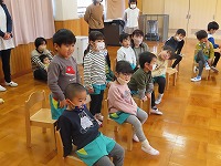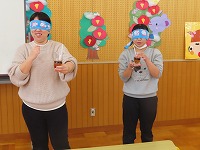 子ども新年会 今日はみんなで新年をお祝いし、子ども新年会をしました。先生達が羽根つき、福笑い、コマまわし、目隠しドリンクを披露し、子ども達は元気いっぱい応援してくれました。