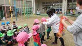 「よくがんばったね」みんなで拍手をしました。園長先生から一人一人にメダルをもらいました。