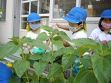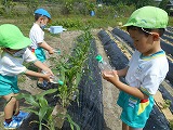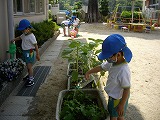 幼稚園の夏野菜に水やりをしてくれました。テントウムシを見つけて遊んでいました。