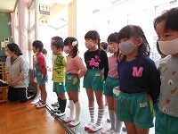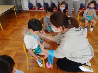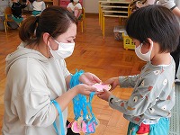 直接、首に掛けてプレゼントすることはまだできませんが、先生に一人ずつ手渡して、担任の先生から掛けてもらいました。
