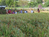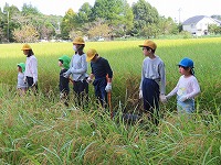 5月にもみまきをし、6月に田植えをした稲が収穫の時を迎え、今日普賢寺小学校5年生と稲刈りをしました。秋風が気持ちよく、秋晴れの中、にぎやかにみんなで稲刈りをすることができました。
