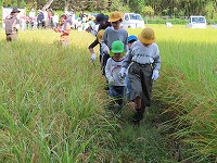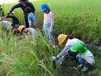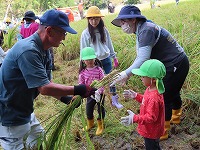 田植えから5年生と年中・年長はペアで活動しているので、すっかり仲良しです。一緒に稲刈りをする姿が微笑ましかったです。