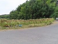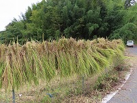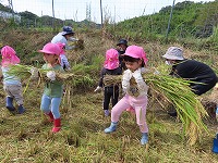 5年生が刈った稲を、幼稚園の子ども達が運びました。コンバインまで運び、脱穀をしてもらいました。わらになった稲を又運んで、稲架(はさ)掛けにしました。