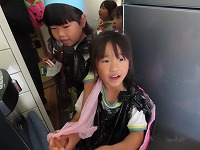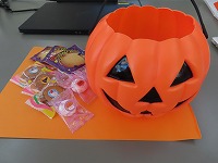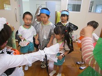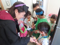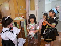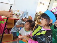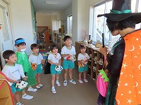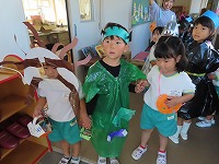 ハッピーハロウィン 今日は、ハロウィン。変装する衣装やお菓子をもらうバッグを作ってこの日を楽しみにしていた子ども達です。異年齢のなかよしトリオグループになって、「どこにいるのかな」と園内を探検しながら、変装している先生たちを探して歩きました。「あ!いたよ。トリック・オア・トリート!」「お菓子をくれないといたずらしちゃうよ」と、上手に言葉も言えました。「クッキーや」「マシュマロ大好き」「ありがとう」と、お菓子をもらえて嬉しそうな子ども達でした。今日は、お菓子を食べたり変装したりと楽しい日になりました。     |