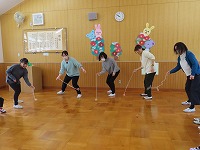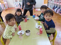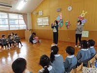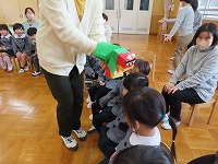 子ども新年会 新しい年をお祝いし、子ども新年会をしました。獅子舞に頭をかまれるとご利益があり、その1年間は無事でいられるという言い伝えから、普賢寺幼稚園の「ししまいちゃん」に噛んでもらいました。子ども達は「わあっ!噛まれた!」といいながら嬉しそうでした。