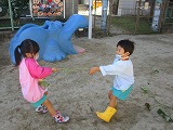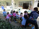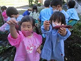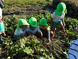 待ちに待ったお芋ほりをしました。地域の大冨さんの畑をお借りし、夏の間水やりを頑張ったり、散歩で見に行ったり…生長を楽しみにしてきました。朝から「早くお芋ほりに行こう!」とワクワクしていました。「今日はみんなの手がスコップです。しっかり手でほりましょう!」と先生が話し、ツルを引っ張り、力を入れてお芋をほりました。